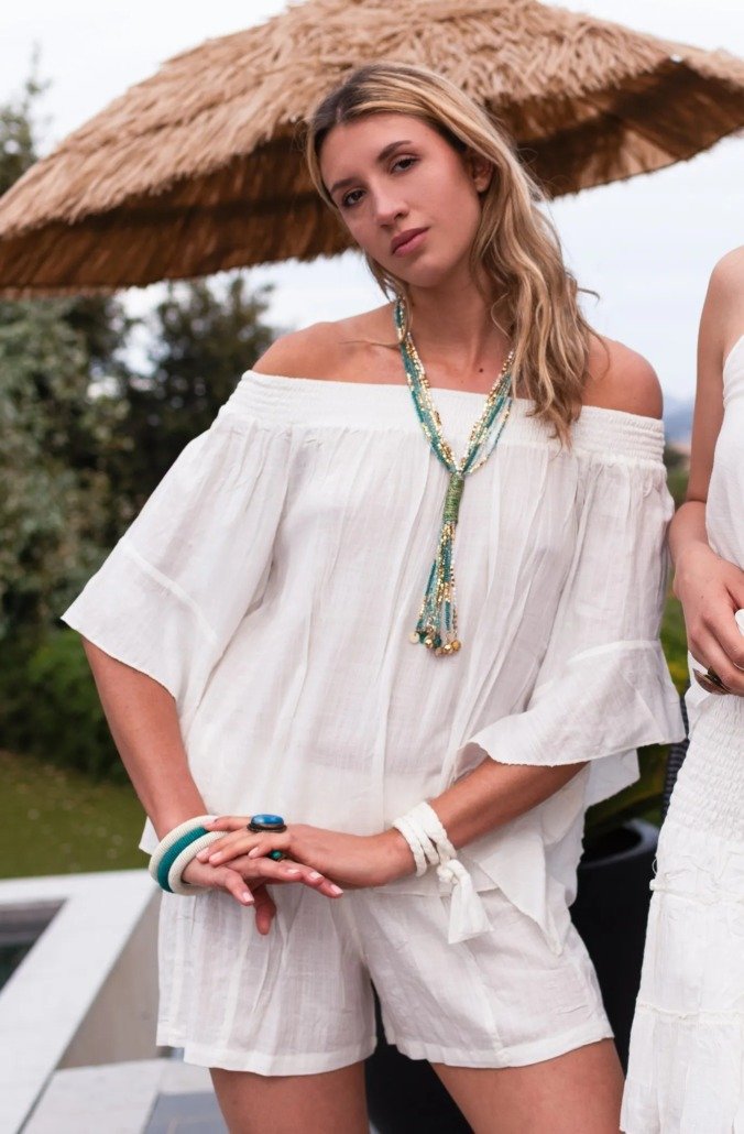 Facile à porter avec un short, un jean ou une jupe longue, il vous accompagne partout — du marché du matin à l’apéro du soir.