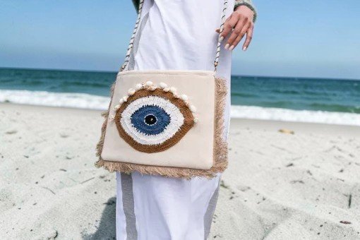 Craquez pour le style! La grande pochette en toile épaisse est 100% CHIC! Tendance unique pour vos vacances! Le style incontournable à avoir absolument dans votre garde robe! Déco oeil brodé bleu, blanc et ocre, orné de cauris, ce qui est ultra tendance pour l’été! Craquez pour elle sans hésiter! La grande pochette en toile Karma se porte à la main mais surtout à l’épaule grâce à sa longue bandoulière en corde. Se ferme par un zip sur toute sa longueur. Intérieur doublé. Un look branché unique qui vous accompagnera sans hésitation! Un look assuré pour vos vacances mais aussi pour tous les jours! Emportez la partout! Fait main. Qualité +++ vous ne serez pas déçue.