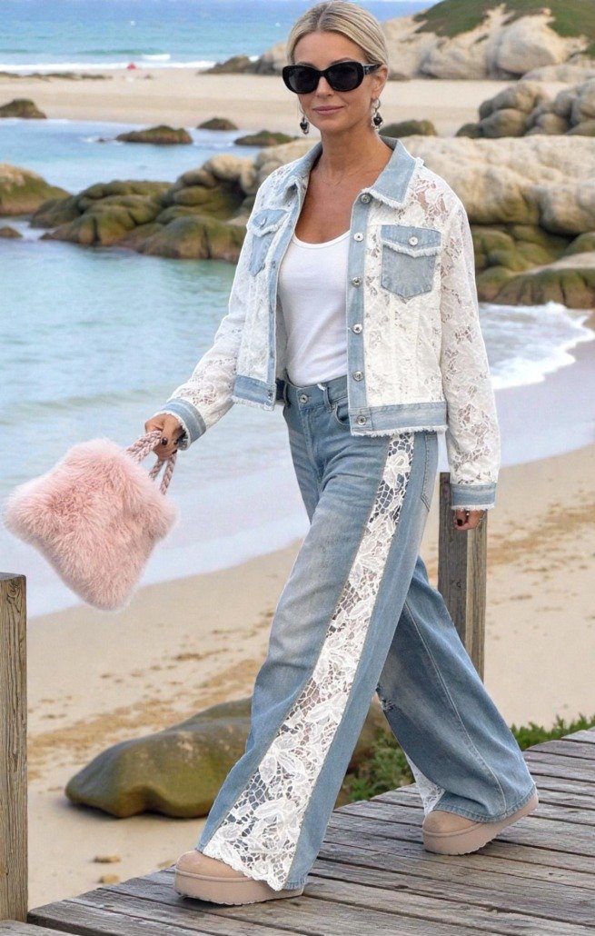Le jean délavé et son détail dentelle a du style!!! Replongez dans les années 60s et soyez fashion… Ce pantalon joliment évasé, dit « wide legs » est un clin d’oeil au passé mais il est surtout une mode branchée! Il faut savoir que le jean wide legs vous assure confort et charme. Il ne marque pas la peau et suit chacun de vos mouvements. Sa taille se positionne sur les hanches et vous enveloppe joliment. A plat ou à talons, il a une coupe folle!