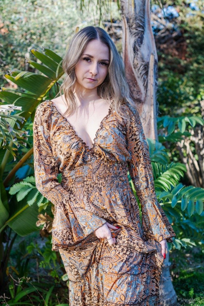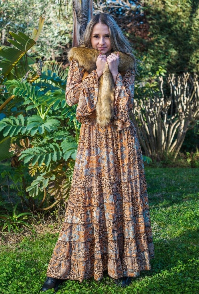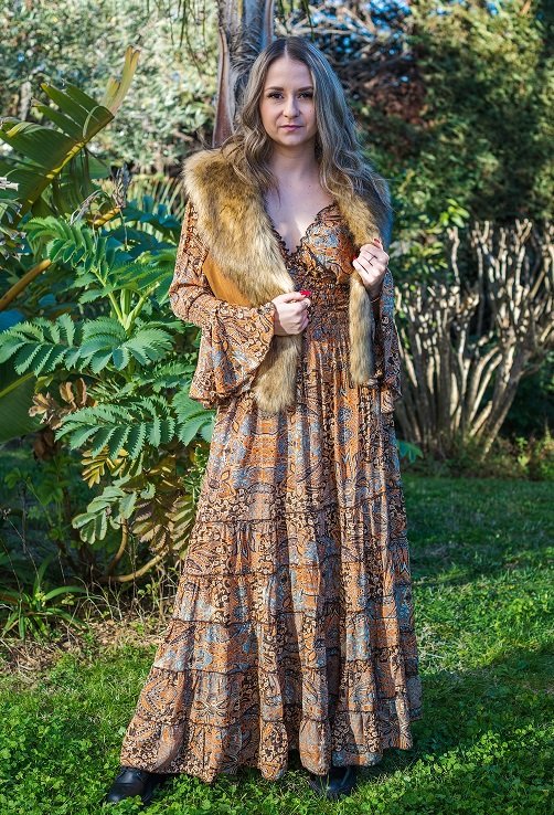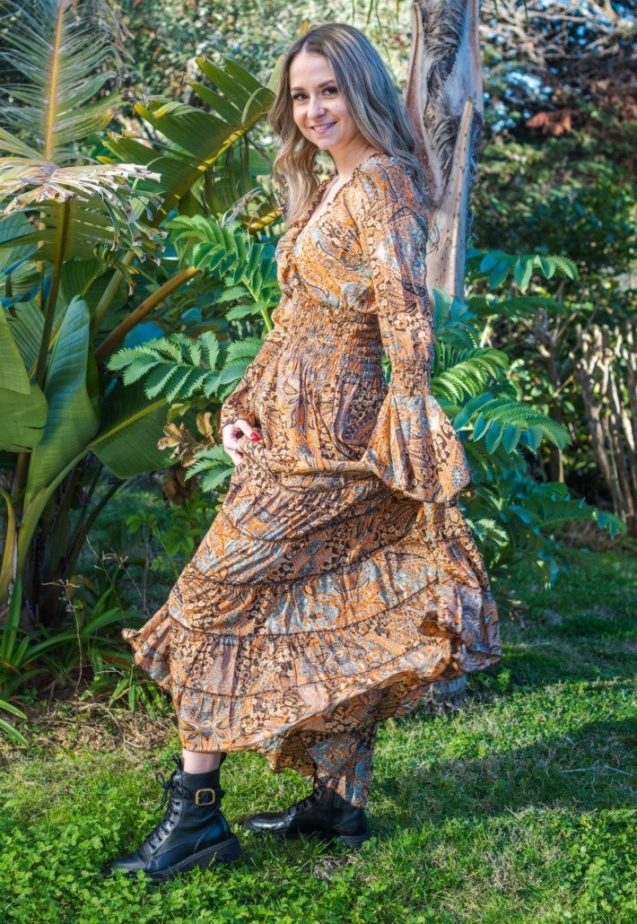 Vous craquerez pour la longue robe bohème chic et sa cascade de volants plats! Elle a tout pour elle et vous donne son style bien à elle. Elle est chic, elle se pose sur vous et vous rend belle! Joli col V plongeant aux finitions petits volants élastiqués, la robe longue en soie (70%) se porte dés l’entrée de l’automne et en hiver avec votre blouson ou votre perfecto. Tendance camel, ocre et beige, son motif floral est à la mode et vous donnera un look chic. Smocké à la taille, elle vous offre une silhouette de rêve! Convient du 36 au 42, et se porte bien longue…