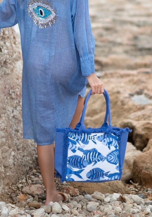 Stylé le sac (ou petit cabas) de plage assorti à son vêtement de plage!!! Nouveauté 2026, on craque pour le style et on se sent déjà en vacances! Motif poisson aux couleurs bleu azur, on est Fan pour l’été!